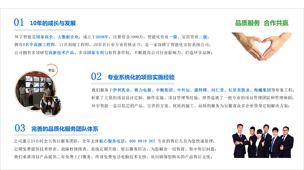 合肥市環(huán)宇智能工程有限公司成立于2008年科創(chuàng)版上市企業(yè),現(xiàn)注冊資金1000整,電子與智能化系統(tǒng)集成資質(zhì)壹級,安防資質(zhì),是“國家高新技術(shù)企業(yè)”、“合肥市高新技術(shù)產(chǎn)品認定企業(yè)”、“安徽省安防協(xié)會會員單位”、“AAA級信用等級認證企業(yè)”、“AAA級重合同守信用企業(yè)”、“合肥市創(chuàng)新型企業(yè)”、是行業(yè)領(lǐng)先的智能化整體解決方案的集成商